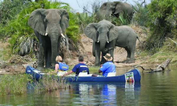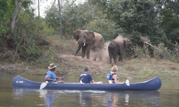 The silence of the three man fiberglass canoe enables one to glide past elephant, hippo and birds almost undetected.